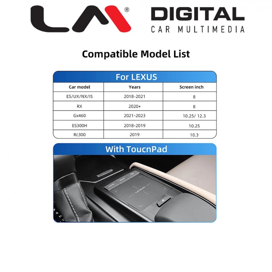 | Συμβατή για μοντέλα | LEXUS ES/UX/NX/IS 2018 > 2021 RX 2020 > GX460 2021 > 2023 ES300H 2018 > 2019 RC300 2009 για εργοστασιακό σύστημα με 8'' οθόνη 10.25'' οθόνη 12.3'' οθόνη |